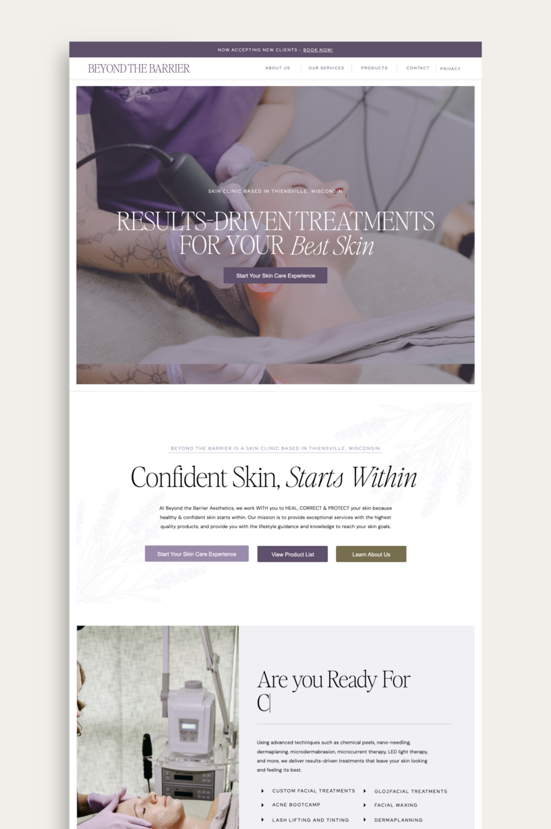 Sleek, Minimalistic, Elegant Website Design. Introducing the stunning new website for Beyond the Barrier Aesthetics, a talented skin care expert and esthetician based outside of Milwaukee. This collaboration beautifully blends our creative vision with Ali’s passion for helping clients achieve their best skin.
