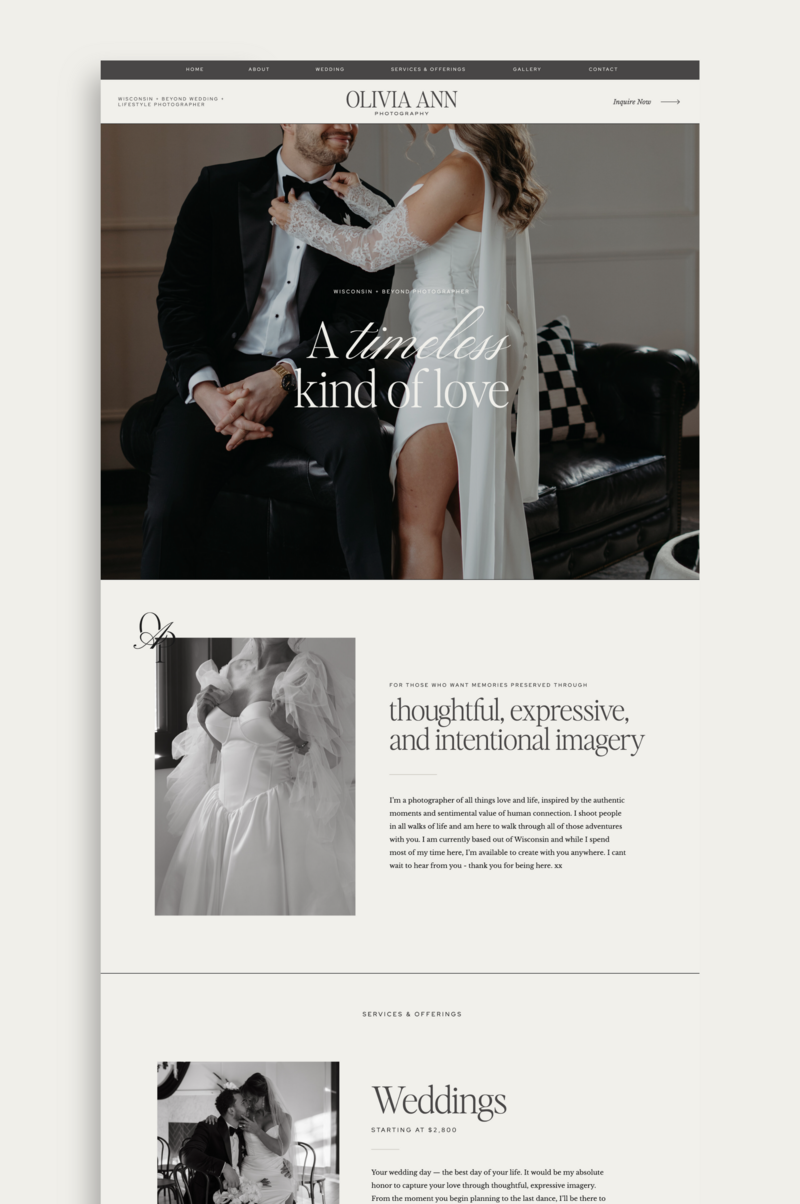 A sleek, modern editorial design for the incredibly talented Olivia Ann Photography.This beautiful Showit website was crafted to perfectly reflect Olivia’s stunning photography, while also elevating her brand’s vision.